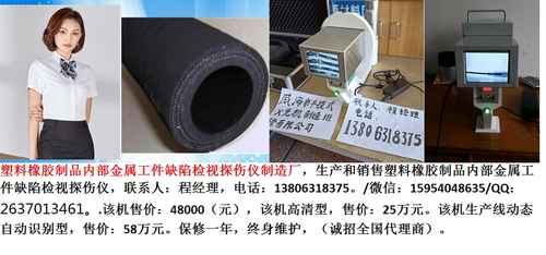 塑料橡膠制品內部金屬工件缺陷檢視探傷儀制造廠,生產和銷售塑料橡膠制品內部金屬工件缺陷檢視探傷儀,聯系人:程經理,電話:13806318375。/微信:15954048635/QQ:2637013461。.該機售價:48000(元),該機高清型,售價:25萬元。該機生產線動態自動識別型,售價:58萬元。保修一年,終身維護,(誠招全國代理商)。該機無需暗室,在明室里一按按鈕,就能看清塑料橡膠制品內部金屬工件缺陷,該機重僅3.5公斤,一個手就提得動,該機每次工作設置50秒定時,到時自動關閉,用時再打開即可,每天可工作約2-3個小時,每連續使用半個小時,需停一個小時左右降溫,以保證機器的使用壽命。每次標配是2-3只射線源,輪換使用,可保證機器連續工作。更多內容,請登陸公司博客:http://blog.sina.com.cn/suliaoxiangtou1,